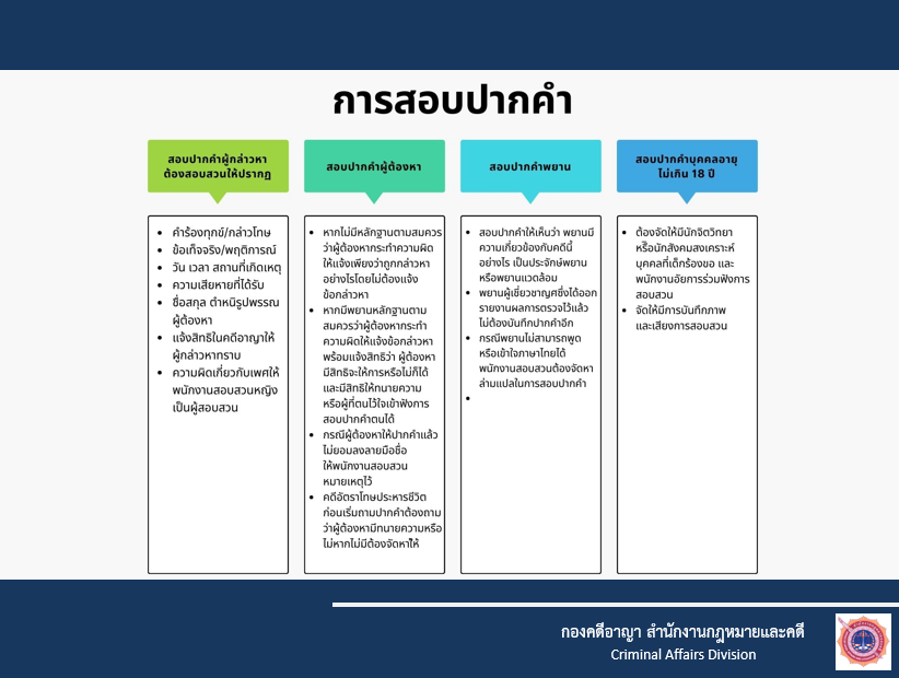 • แนวปฏิบัติ ได้แก่ การสอบปากคำบุคคลที่ต้องสงสัย หรือกรณีมีผู้มาร้องทุกข์หรือกล่าวโทษไว้ที่สถานีตำรวจ การสอบปากคำในฐานะพยานโดยยังไม่มีการแจ้งข้อกล่าวหา การสอบปากคำผู้ต้องหา เป็นต้น