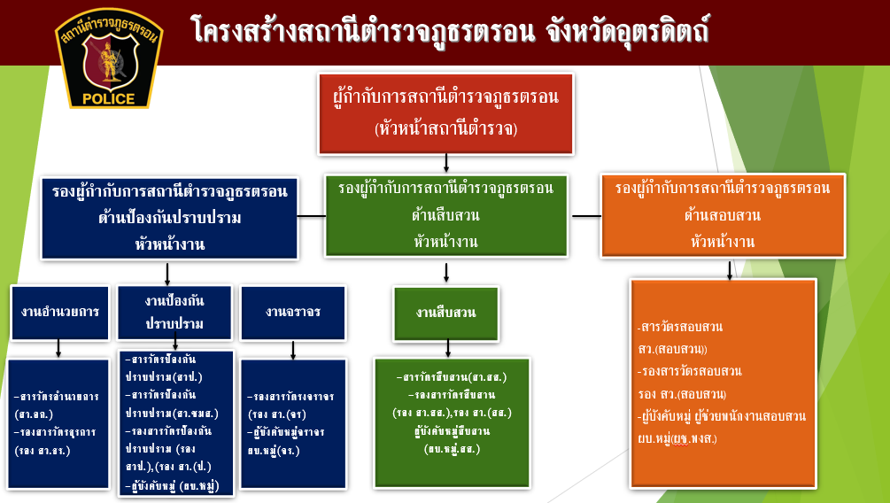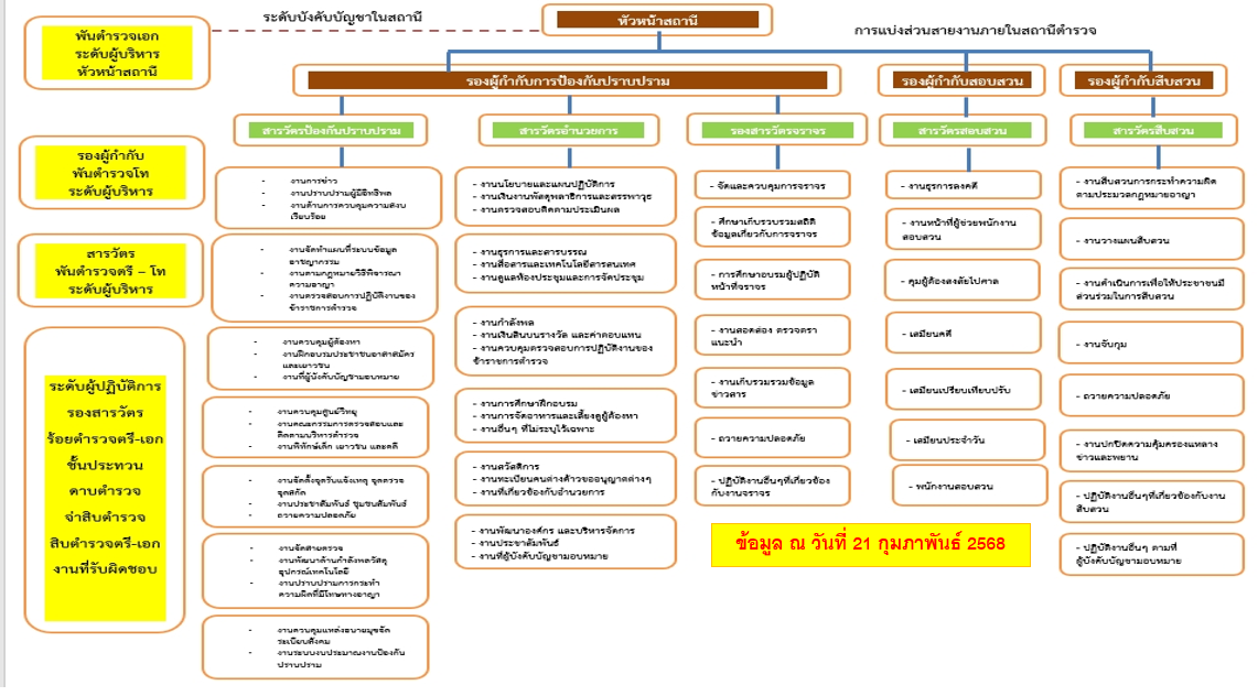 มีหน้าที่เกี่ยวกับการวางแผน อำนวยการ สั่งการ ควบคุม กำกับ ดูแล ตรวจสอบติดตามและประเมินผล ตลอดจนปฏิบัติงานในด้านการป้องกันอาชญากรรมและรักษาความสงบเรียบร้อยงานคณะกรรมการตรวจสอบและติดตามการบริหารงานตำรวจ งานชุมชนและมวลชนสัมพันธ์ในรูปแบบต่าง ๆ รวมทั้งงานที่มีลักษณะเกี่ยวข้องหรือเป็นส่วนประกอบของงานนี้ เพื่อมิให้เกิดอาชญากรรมขึ้นในเขตอำนาจ การรับผิดชอบหรือพื้นที่ปกครองของสถานีตำรวจ